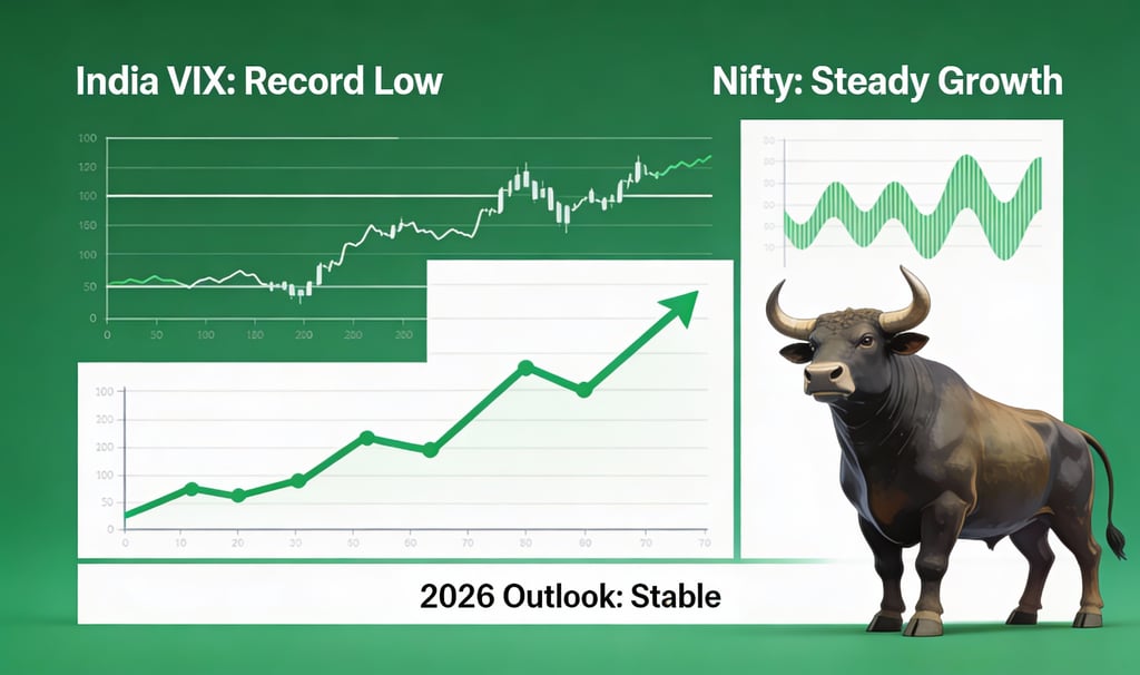 India's VIX at a record low signals low market fear, high investor confidence, and stable or rising stocks ahead into 2026.