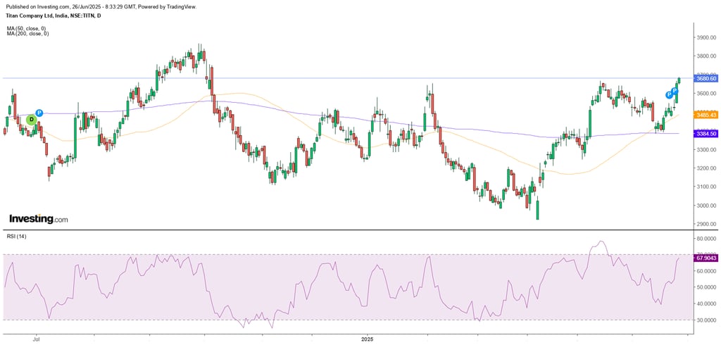 In the stock market, Titan’s shares experienced some fluctuations. On June 25, 2025, the stock rose by 1.29% to ₹3,591 but saw a slight dip of 0.05% on June 26, trading at ₹3,668. Despite these minor changes, the stock has delivered a 2.03% gain for the month so far. Market experts remain positive, with Macquarie maintaining an “Outperform” rating and a target price of ₹4,150, indicating potential growth ahead.